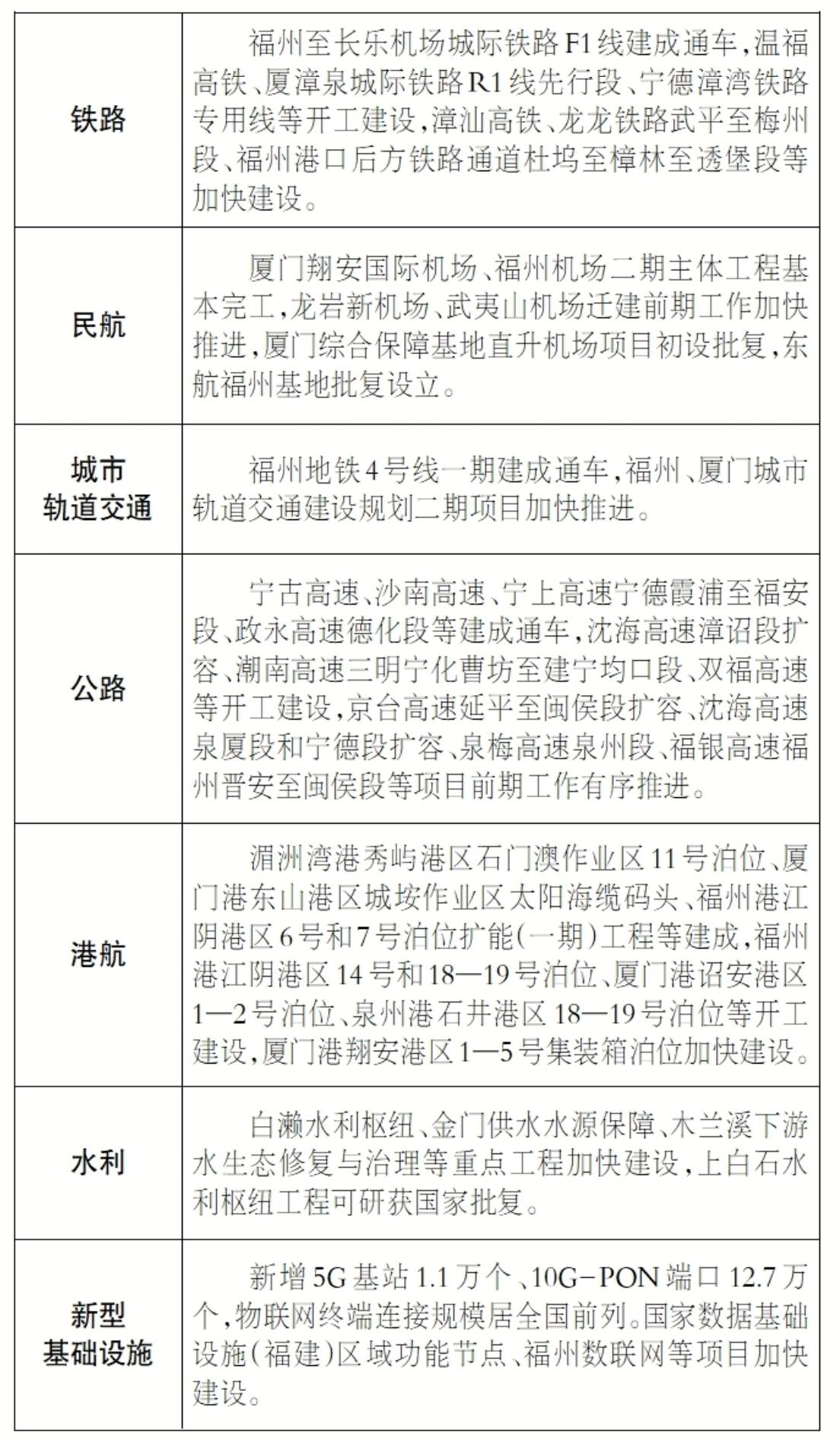 二是投资结构不断优化。加强项目谋划储备,围绕重大战略规划目标和人民群众急难愁盼,系统谋划项目超8000个、总投资超5万亿元。积极争取资金支持,获批中央预算内投资150亿元,投放新型政策性金融工具资金233.9亿元,发行地方政府专项债券1542亿元,一批“两重”建设项目获得超长期特别国债资金支持。狠抓重大项目攻坚,1550个省重点项目完成投资7398亿元、超额完成年度计划,一批标志性项目取得新进展,福州至长乐机场城际铁路F1线号线一期等建成通车,厦门翔安国际机场、福州机场二期主体工程基本完工,温福高铁、厦漳泉城际铁路R1线号机组、沈海高速漳诏段扩容工程等开工建设,全省工业投资、基础设施投资分别增长6.1%、5.6%。推进大规模设备更新,设备工器具购置投资增长12.3%。促进民间投资发展,推动13个项目纳入全国重点民间投资项目库,全省首个引入民营资本的重大核电项目(华能霞浦核电一期)获国家核准,首单民营企业基础设施领域不动产投资信托基金(REITs)项目正式上市。完善招商统筹机制,签约亿元以上项目3317个、计划投资2.3万亿元,纳入跟踪管理的全省重大招商项目共1047个、累计完成投资6937亿元。