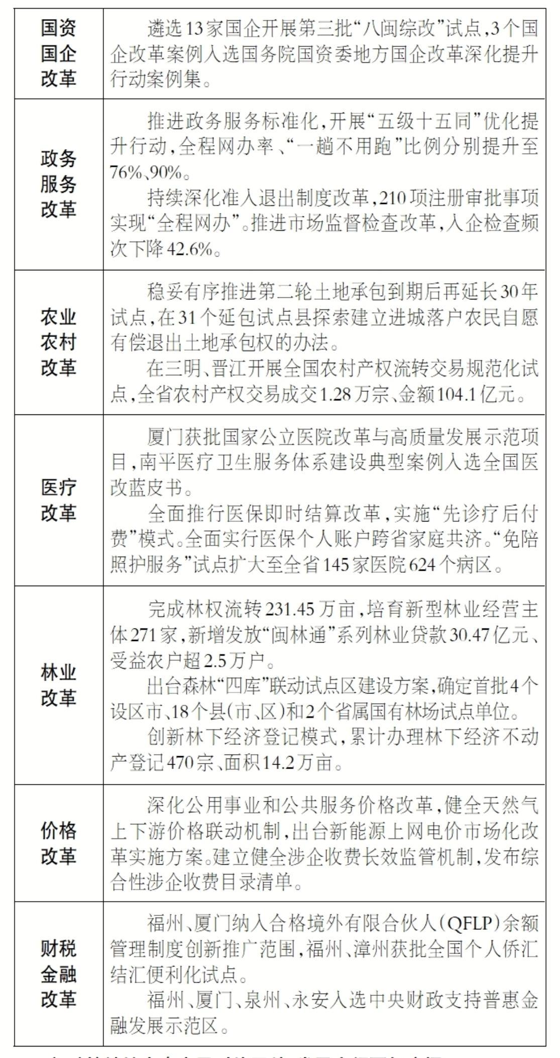 三是重点领域改革蹄疾步稳。国企改革深化提升行动圆满收官,形成综合改革试点企业74家,重组组建省工业控股集团。印发实施贯彻落实《全国统一大市场建设指引(试行)》重点任务事项清单,深入开展市场准入壁垒清理整治行动,破除市场准入壁垒126个。福厦泉要素市场化配置综合改革试点获国务院批复。福厦漳泉低效用地再开发试点实施项目11.6万亩,三明、莆田、南平、宁德增列为试点城市。“清单式”推广三明医改经验,公立医院综合改革效果评价连续10年位居全国前列,率先在省级层面规范制发“福林票”,林长制督查考核连续3年获评优秀等次,医改、林改等福建特色改革经验走向全国。